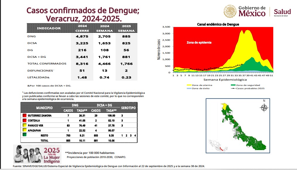 De acuerdo al reporte de vigilancia epidemiológica de la Secretaría de Salud, el Estado de Veracruz reporta al corte de la semana 38 correspondiente al 22 de septiembre, mil 766 casos confirmados y dos defunciones.