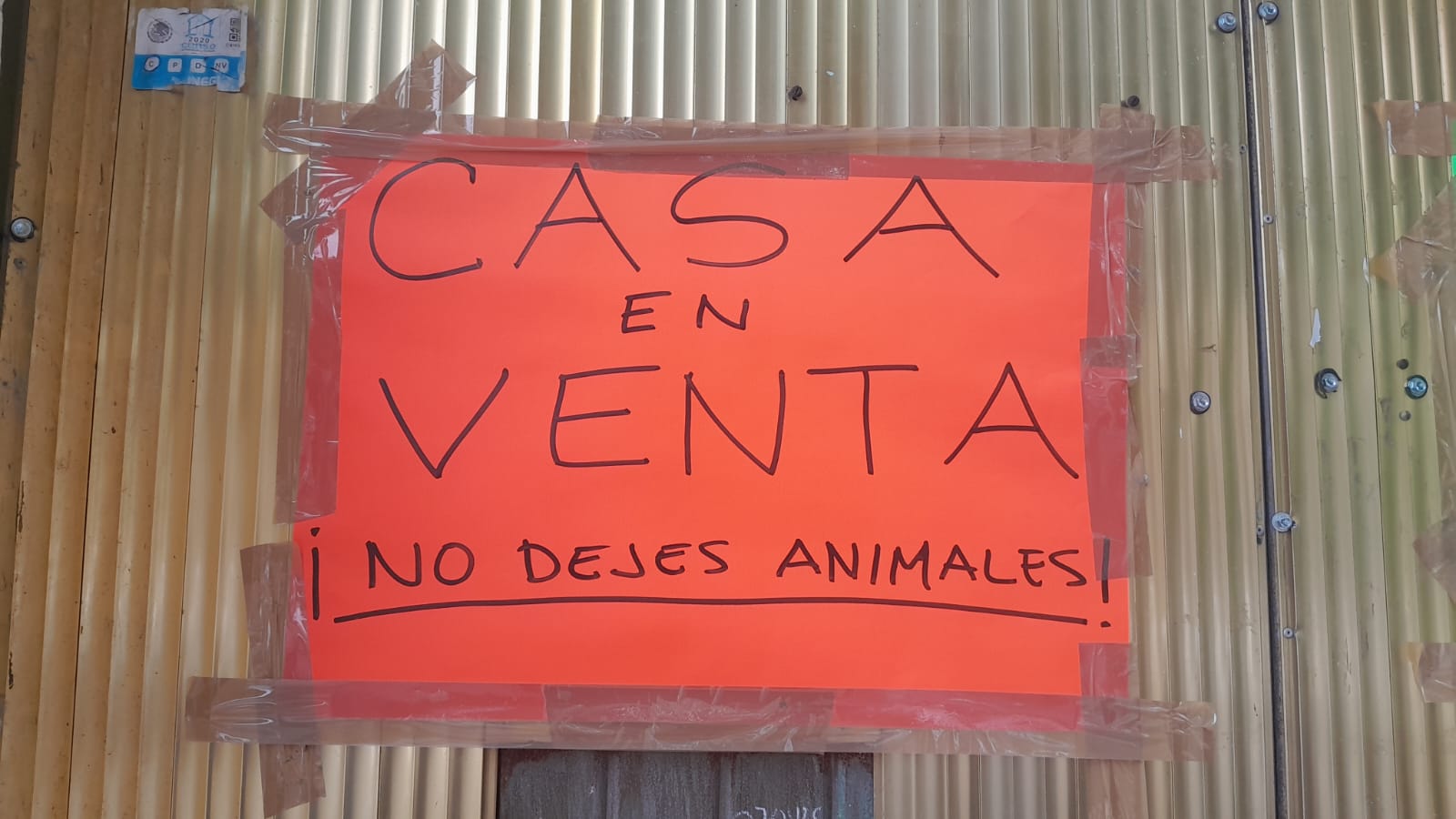 En la puerta se encuentran dos anuncios con las leyendas "Casa vacía, no dejes animales" y "Casa en venta".