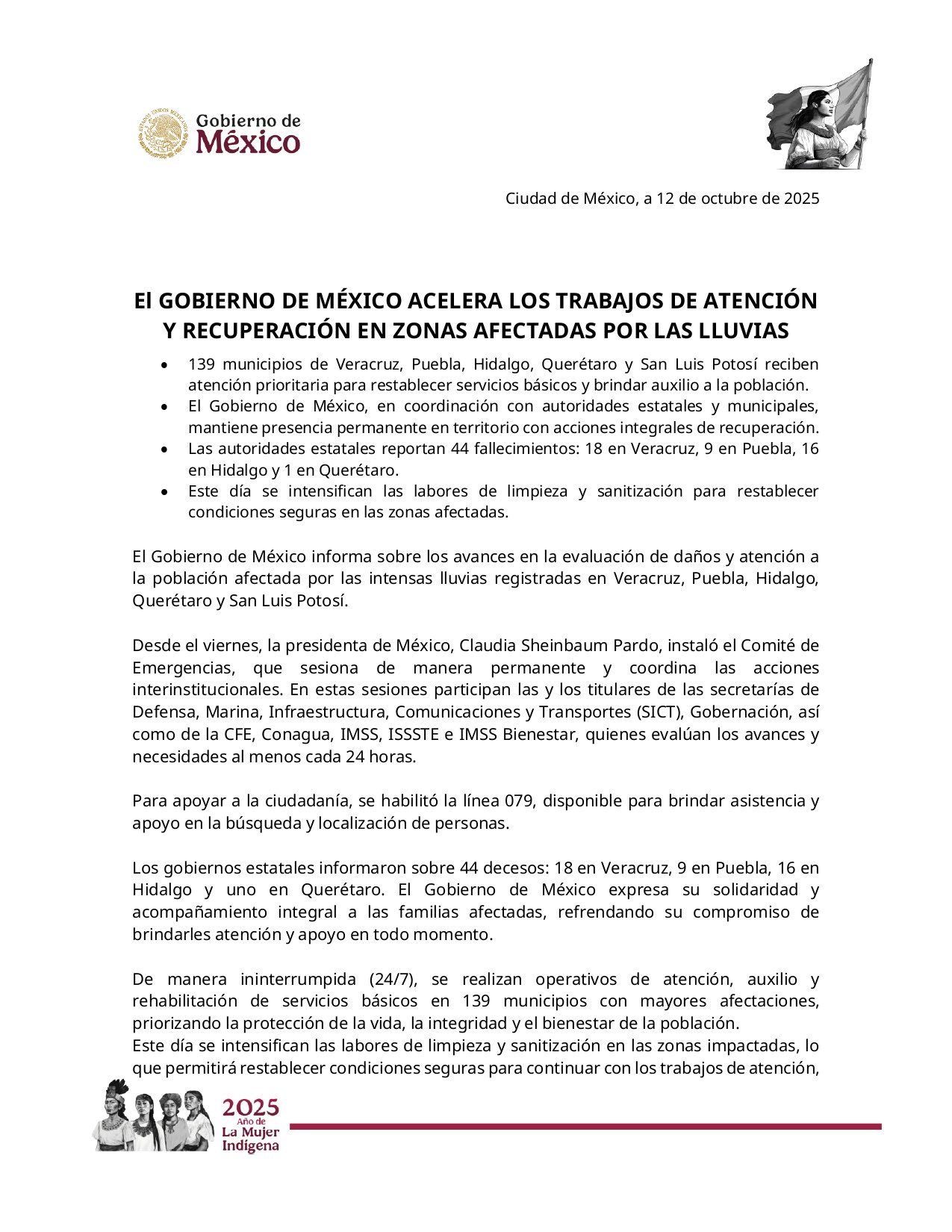 Mediante un comunicado el Gobierno de México informa sobre los avances en la evaluación de daños y atención a la población afectada por las intensas lluvias registradas en Veracruz, Puebla, Hidalgo,vQuerétaro y San Luis Potosí.