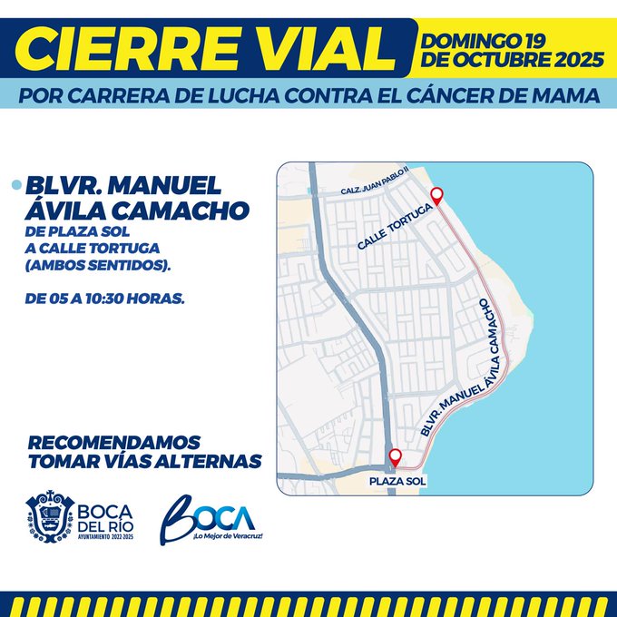 El Ayuntamiento de Boca del Río anunció el cierre temporal del bulevar Manuel Ávila Camacho este domingo 19 de octubre, debido a la realización de la carrera de lucha contra el cáncer de mama.