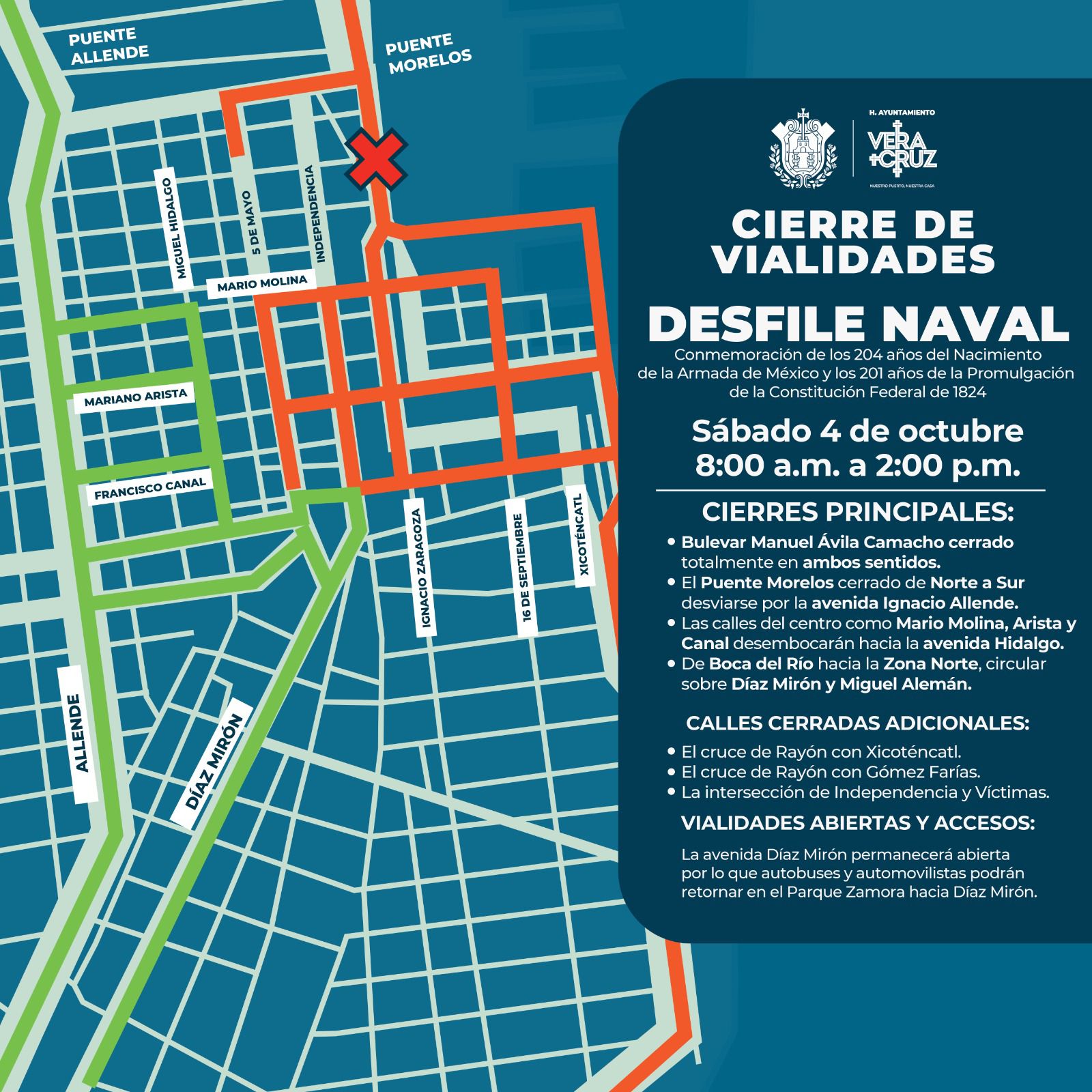 El Ayuntamiento de Veracruz informó que este sábado 4 de octubre se aplicarán cierres viales debido al Desfile Naval, en conmemoración de los 204 años de la Armada de México y los 201 años de la Constitución Federal de 1824.