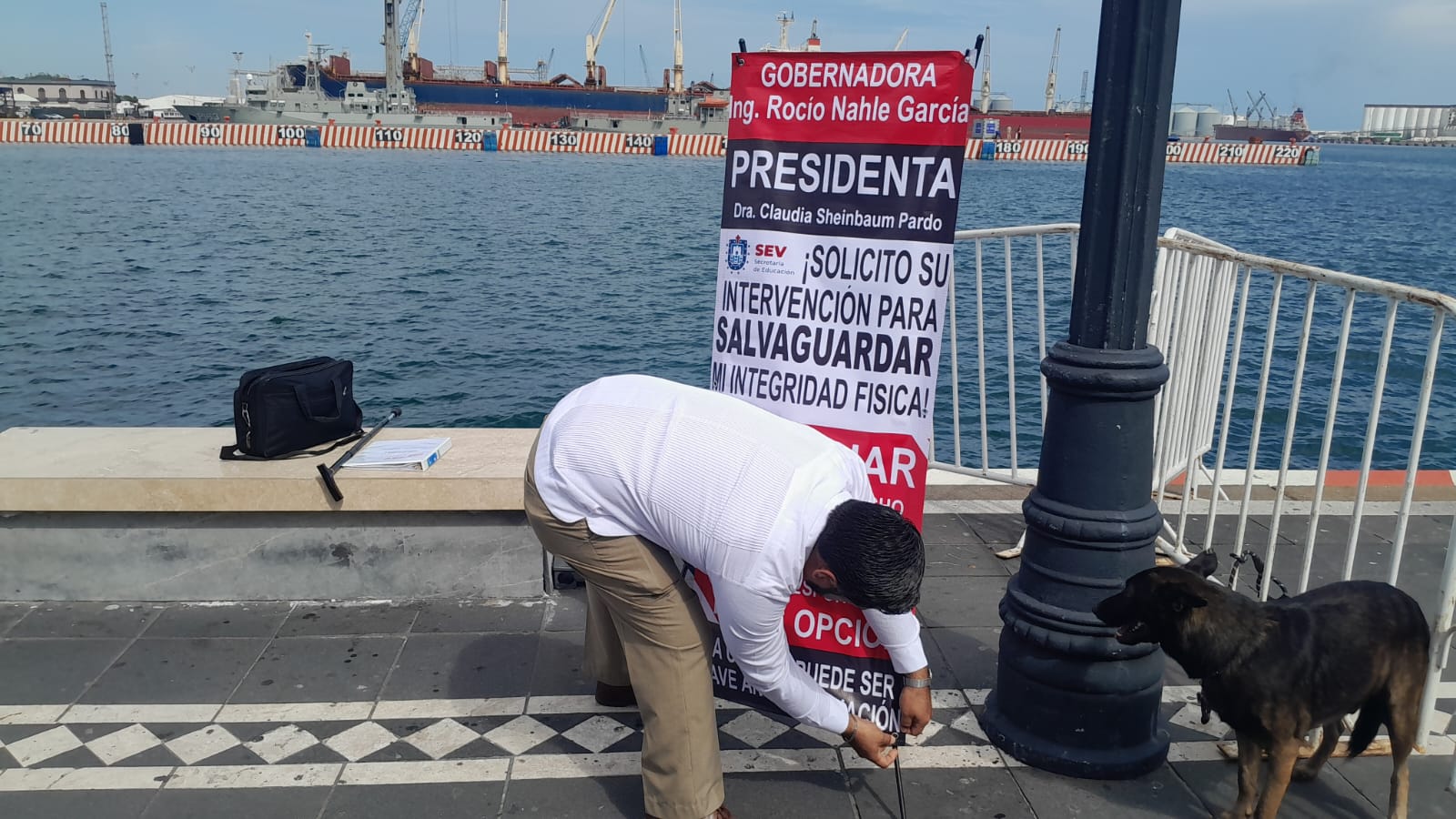 A pocas horas del evento conmemorativo de La Marina que encabezará la presidenta Claudia Sheimbaum Pardo en la Macroplaza del Malecón de la ciudad de Veracruz, el profesor Juan Miguel Ríos Andrade decidió encadenarse en protesta contra el incumplimiento del pago del seguro por invalidez que las autoridades educativas estatales le deben.