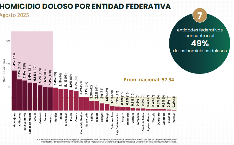 Sin embargo pese a lo alarmante de la estadística el acumulado de enero a agosto de 2025, Veracruz contabilizó 641 homicidios dolosos, ubicándose en el lugar 11 en el ámbito nacional. Que Veracruz ocupe porcentaje relevante del total nacional en homicidios dolosos en agosto muestra que sigue siendo un territorio de alta conflictividad. Con 100 casos en un solo mes, el promedio diario se ubica en más de 3 homicidios al día, cifra que refleja inseguridad persistente pero multifactorial.