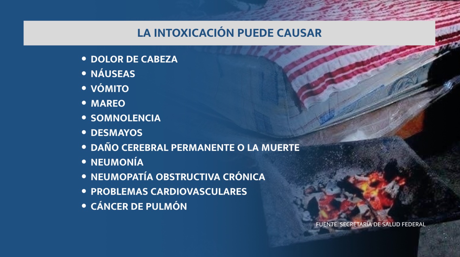 De acuerdo a especialistas la intoxicación por Monóxido de Carbono (CO), es el riesgo más grave y potencialmente mortal para quienes lo inhalan.