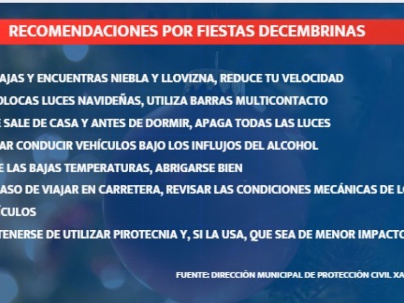 La Dirección de Protección Civil de Xalapa emitió una serie de recomendaciones preventivas a la población por las fiestas decembrinas, a fin de reducir el número de accidentes los próximos días.