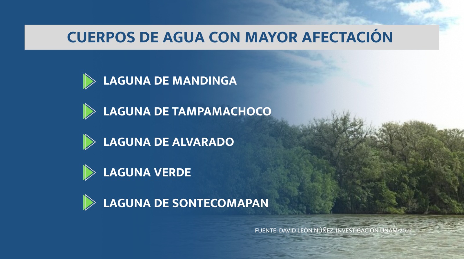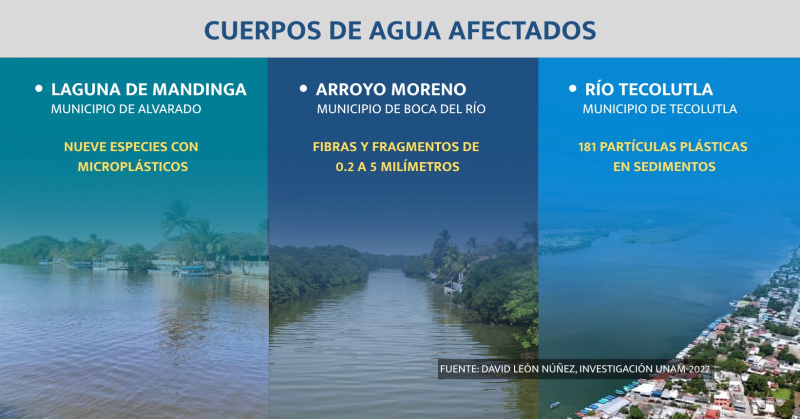 En la laguna de Sontecomapan, ubicada en la zona de Los Tuxtlas, se reporta la presencia de entre siete y 26 ítems de microplásticos por litro, derivado de las descargas de los ríos Coxcoapan, La Palma y del Fraile.