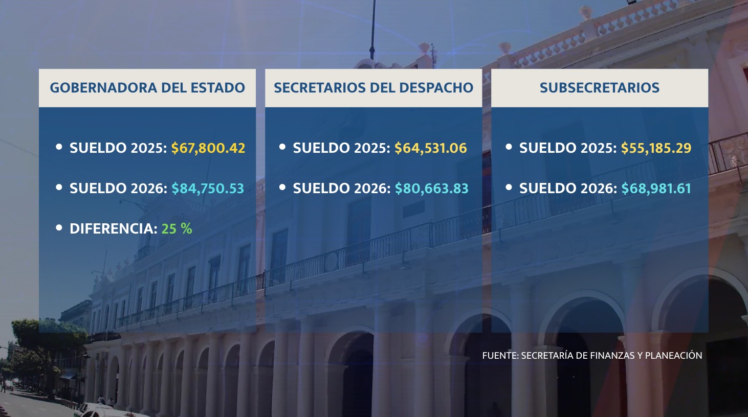 Y adicionalmente, la titular del Poder Ejecutivo ganará un 25 por ciento por encima de su sueldo de 2025. Sus secretarios de despacho y subsecretarios también recibirán dicho incremento.