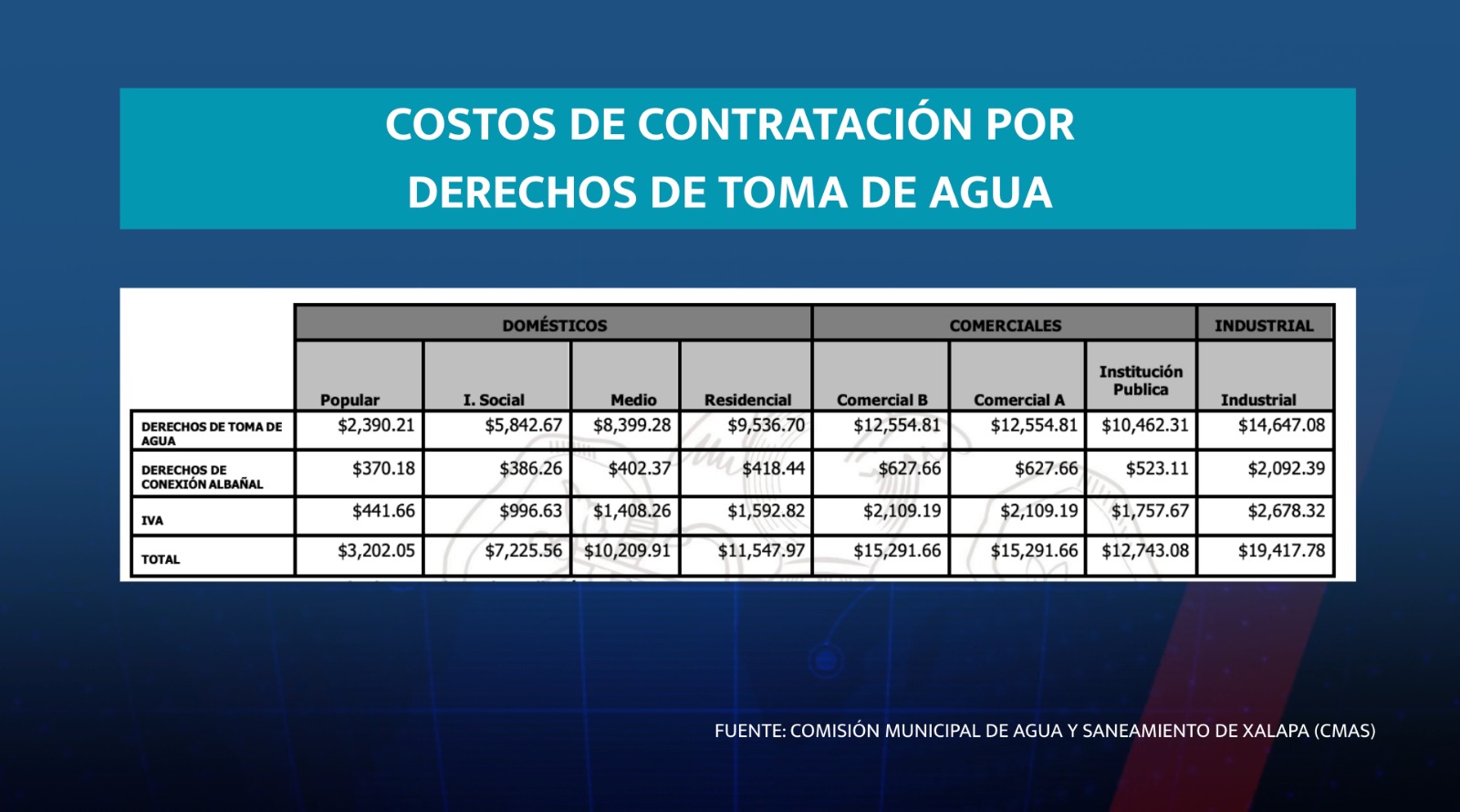 Con el IVA, esto hace que una sola familia deba pagar entre 3 mil 200 pesos y 11 mil 500 pesos para tener agua potable en su casa, dependiendo la clasificación de su domicilio.