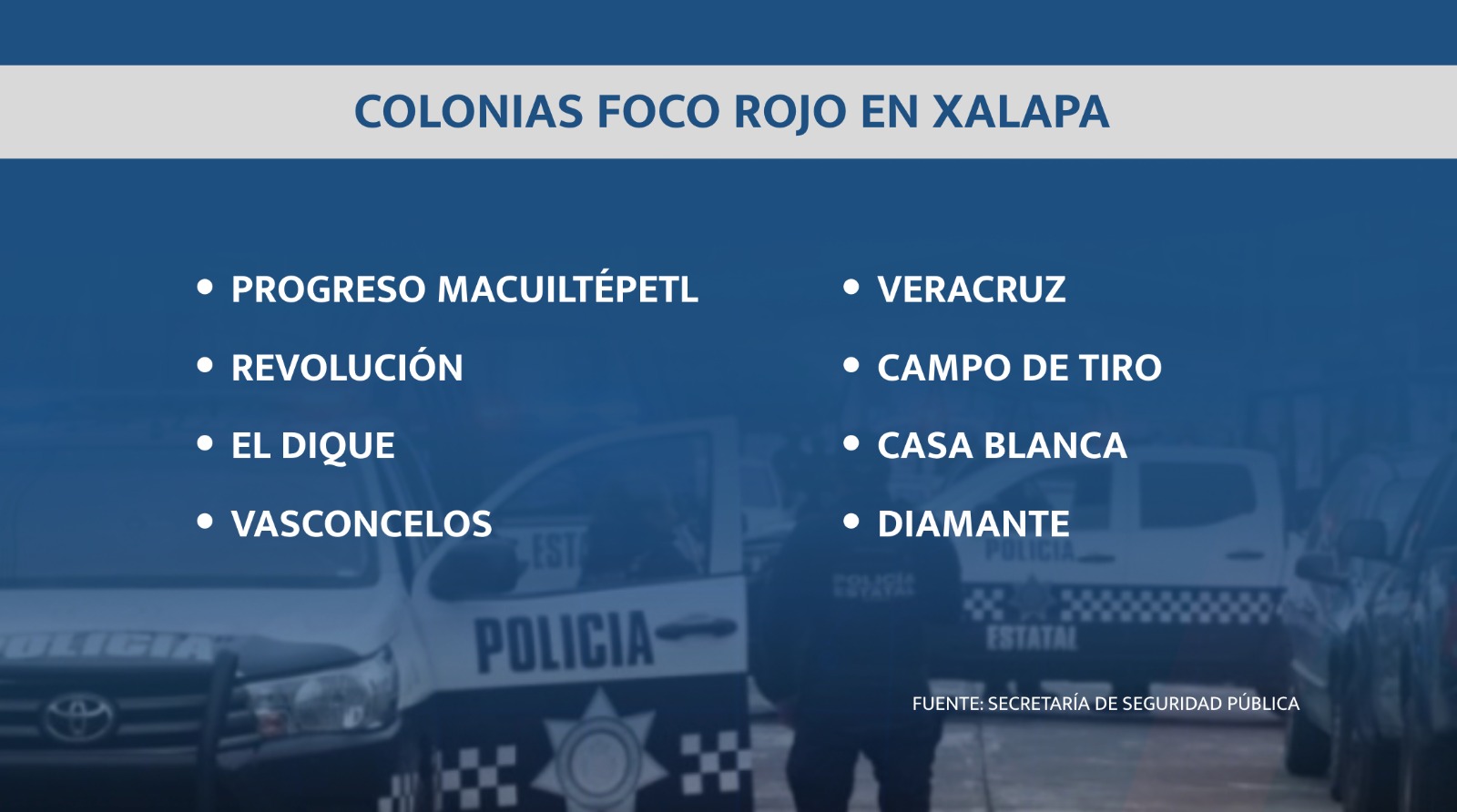 En la ciudad capital se han detectado como puntos rojos las colonias Progreso Macuiltépetl, Revolución, El Dique, Vasconcelos, Veracruz, Campo de Tiro, Casa Blanca y la Diamante.