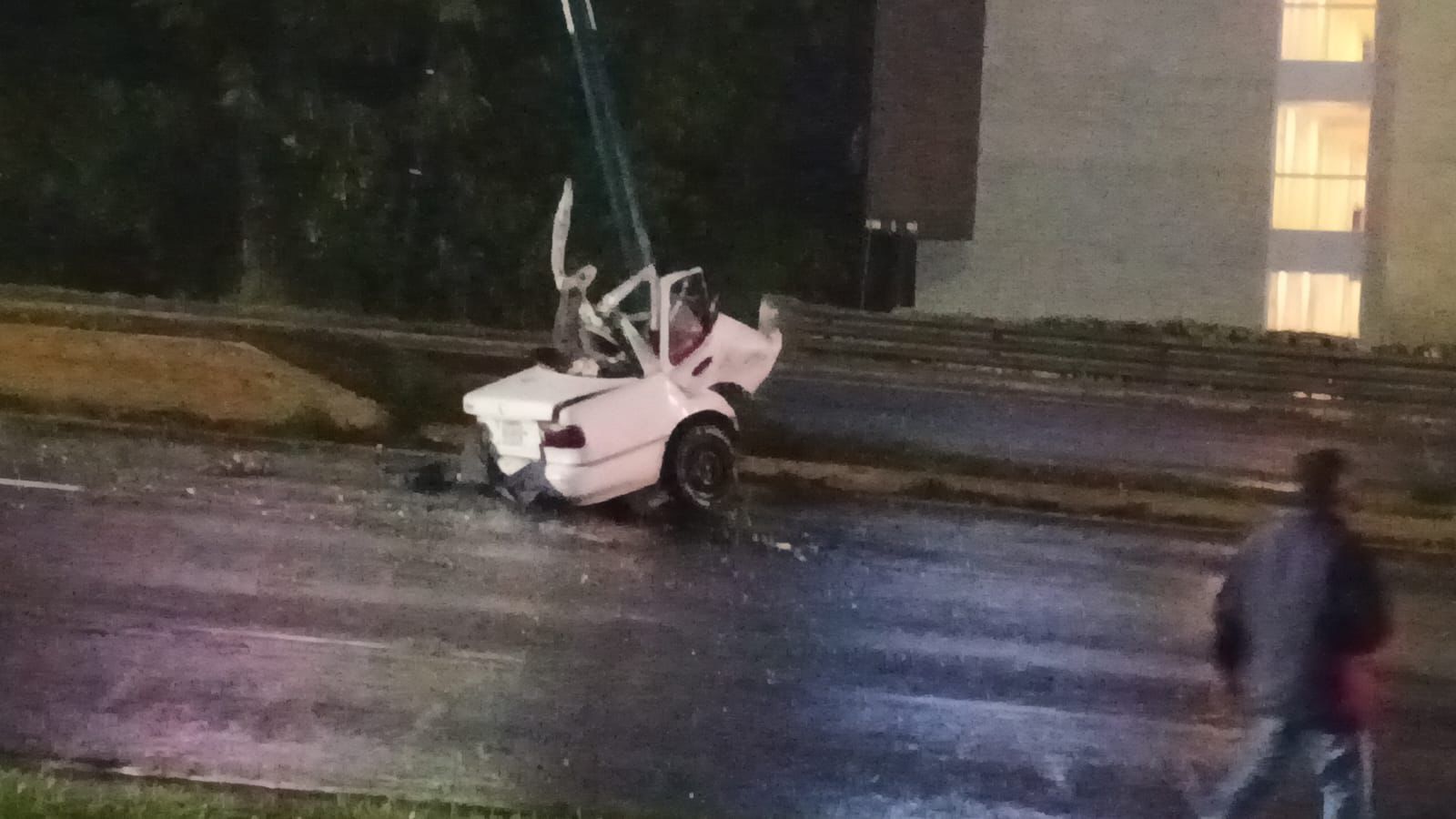 Durante la madrugada de este 12 de diciembre, el conductor de un vehículo Nissan Tsuru se impactó contra una luminaria ubicada en el camellón central de la carretera Xalapa - Veracruz, a la altura de Plaza Américas. A consecuencia del choque, la unidad quedó partida en dos.