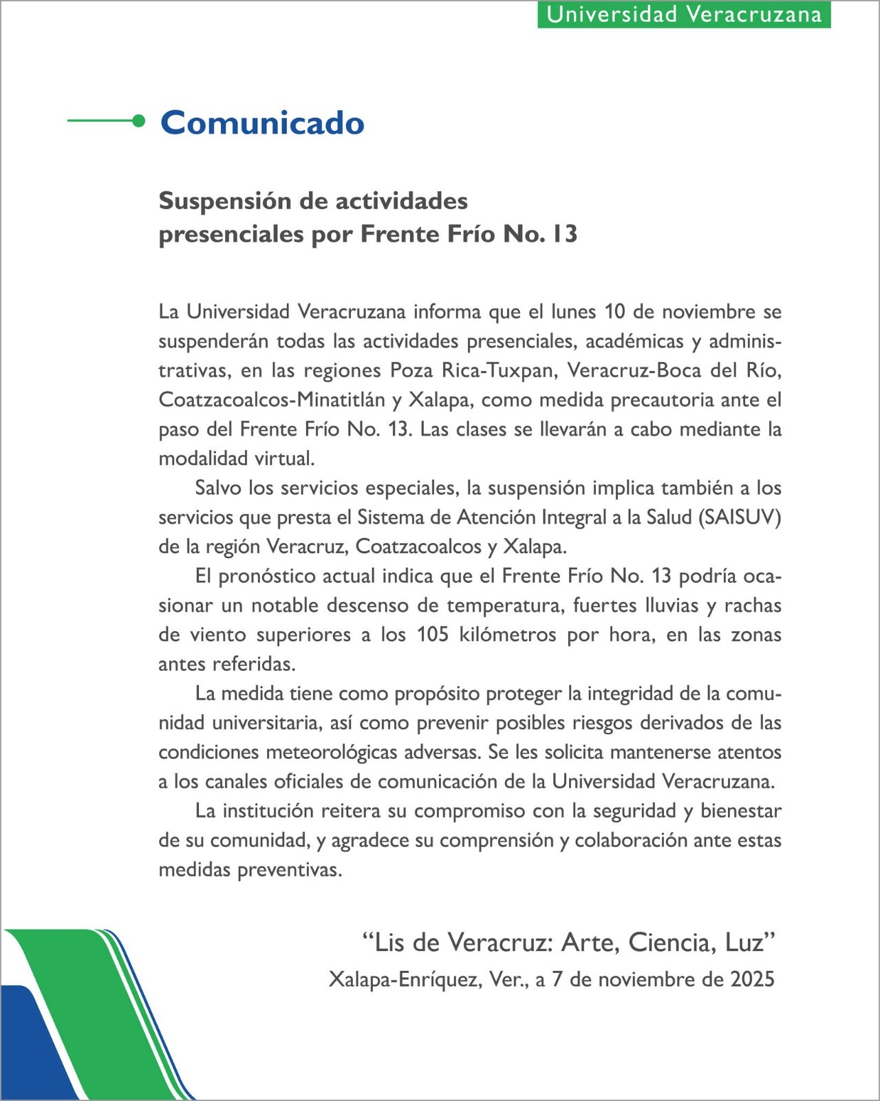 La Universidad Veracruzana (UV) a través de un comunicado confirmó la suspensión de actividades presenciales, académicas y administrativas para el próximo lunes 10 de noviembre, como medida precautoria ante el paso del Frente Frío N. 13.