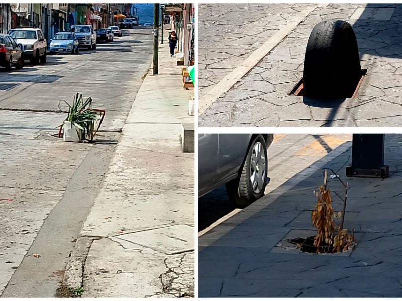 Registros y alcantarillas sin tapa en calles del centro de Coatepec