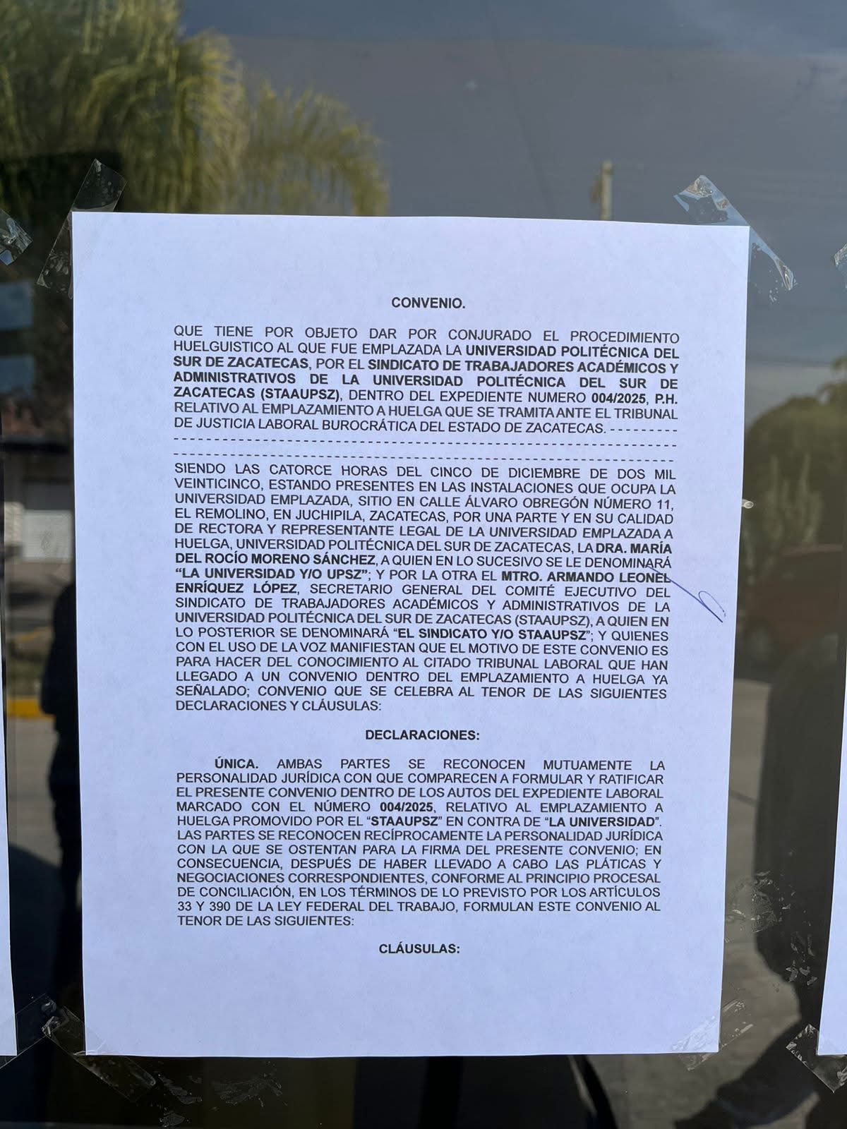 Zacatecas, Zac. Aunque existía un convenio preliminar entre la Universidad Politécnica del Sur de Zacatecas (UPSZ) y el Sindicato de Trabajadores Académicos y Administrativos (STAAUPSZ) para conjurar el emplazamiento a huelga, dicho acuerdo no fue firmado por la rectora María del Rocío Moreno Sánchez, lo que ocasionó que los documentos perdieran validez legal el pasado viernes por la tarde.