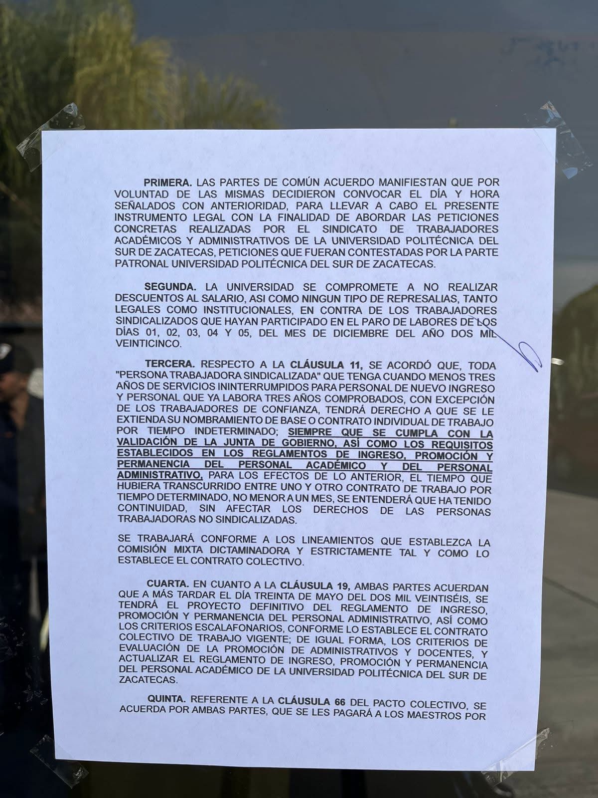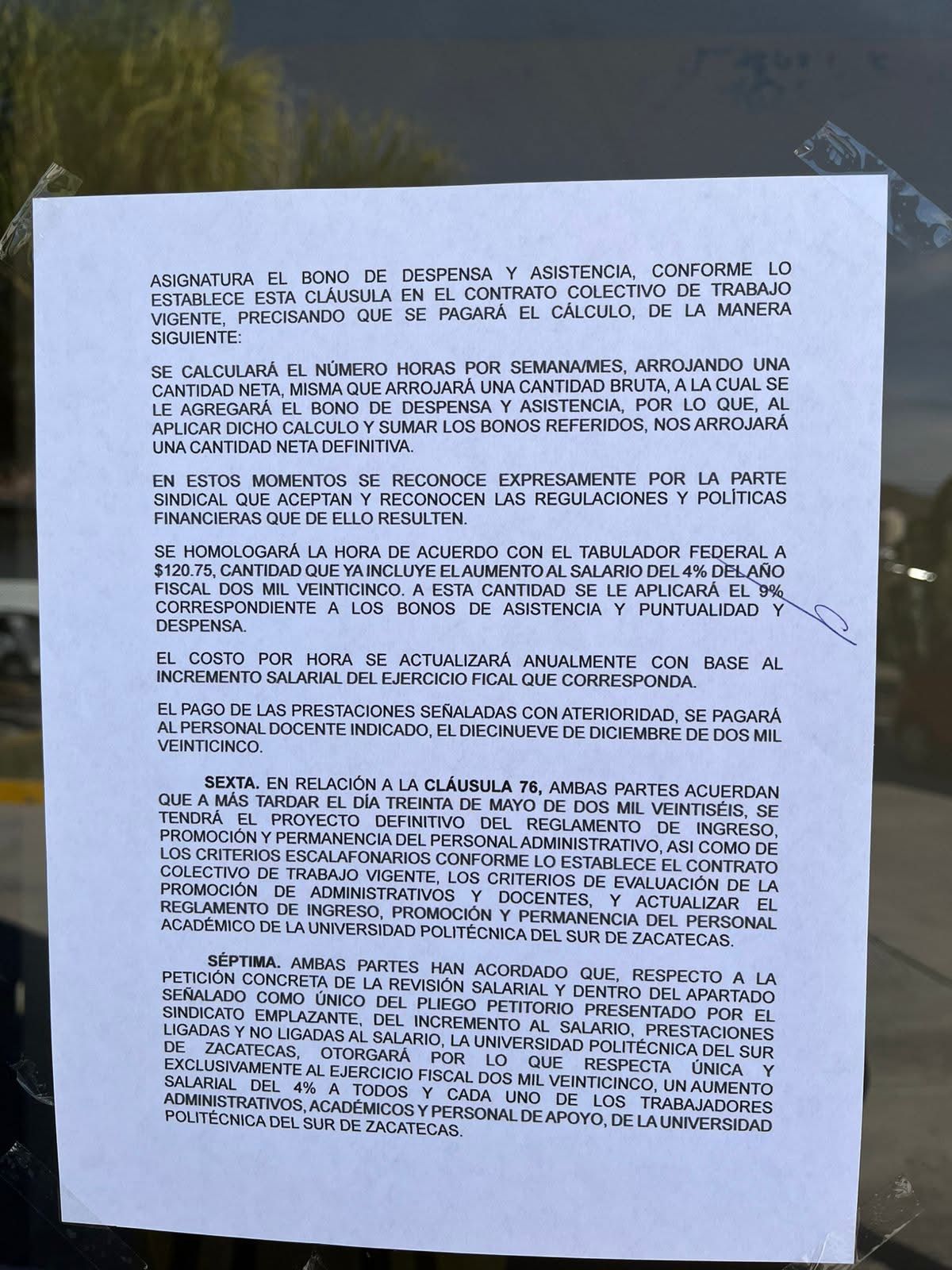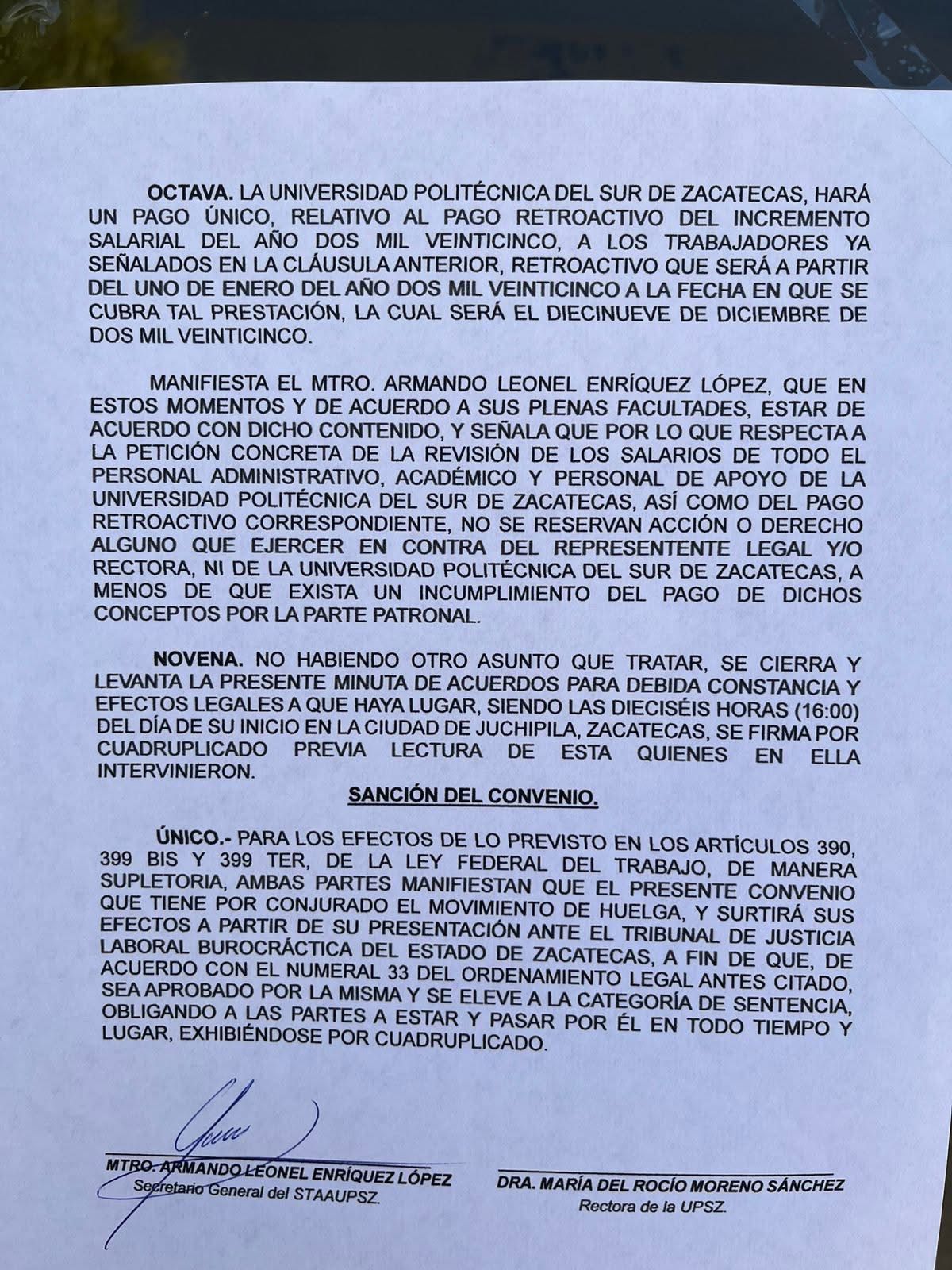 No obstante, ninguno de estos puntos pudo formalizarse debido a la falta de firma de la representación patronal. Dirigentes del STAAUPSZ instaron nuevamente a la rectora y al gobierno estatal a intervenir de manera responsable, afirmando que existe viabilidad financiera para cumplir con las demandas y que la comunidad estudiantil es la más afectada por la prolongación del conflicto.