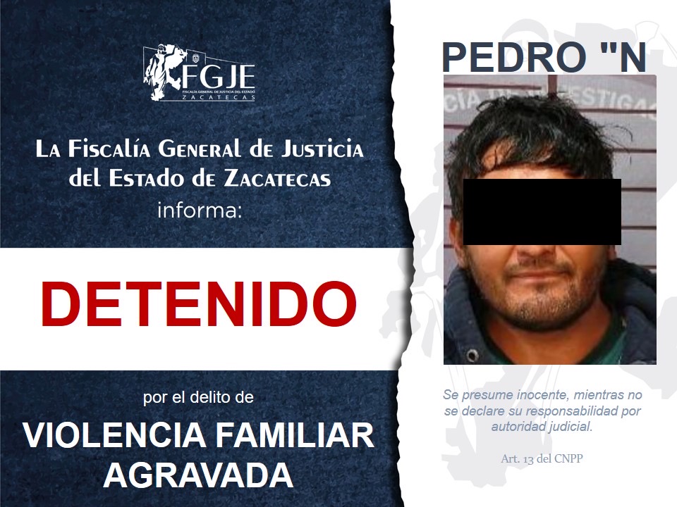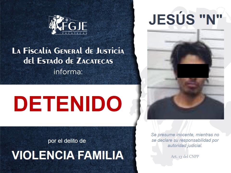 De acuerdo con la información oficial, Jesús "N" fue detenido en el municipio de Guadalupe, donde autoridades cumplimentaron una orden de aprehensión en su contra por el delito de violencia familiar.