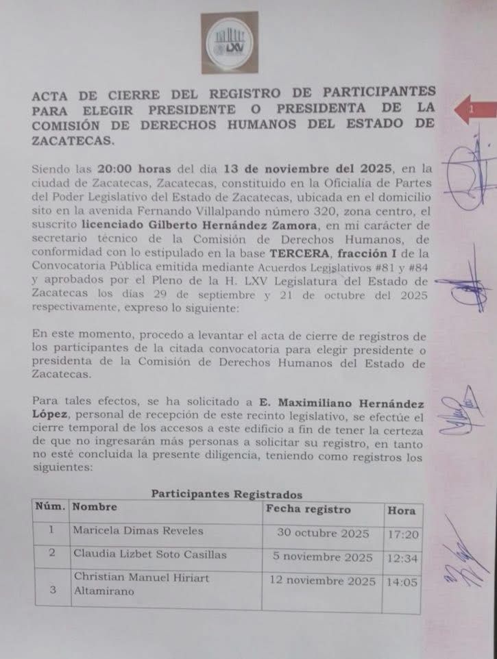 ZACATECAS, ZAC En el marco del proceso de selección para la presidencia de la Comisión de Derechos Humanos del Estado de Zacatecas (CDHEZ), Claudia Lizbet Soto hizo un llamado público a garantizar que dicho procedimiento se conduzca bajo los principios de legalidad, imparcialidad, transparencia y objetividad.