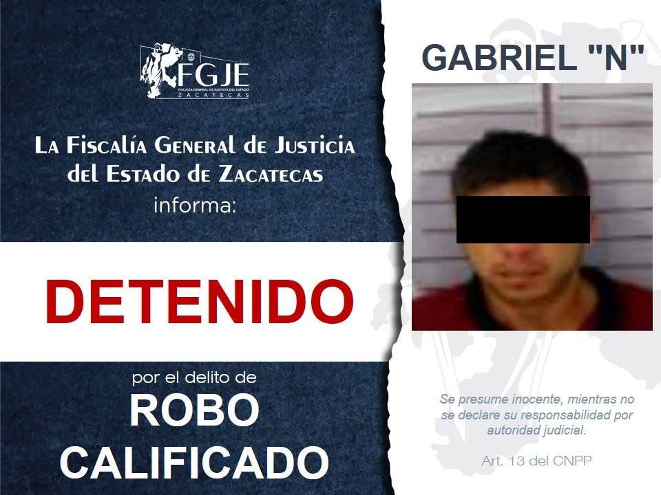 Por otra parte, en el municipio de Fresnillo, fue cumplimentada la orden de aprehensión en contra de Gabriel "N", por su probable participación en el delito de robo calificado.