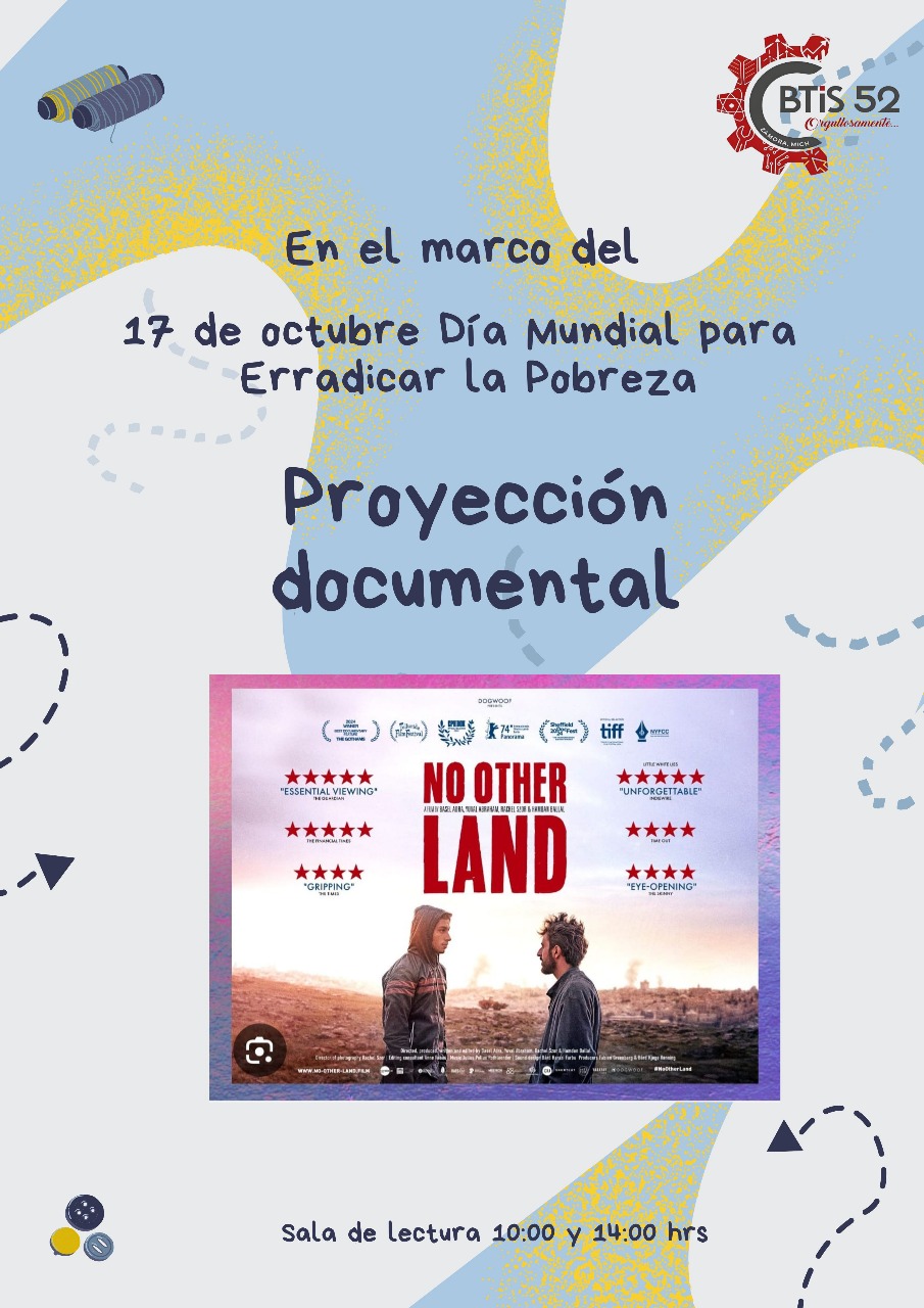 Como parte del programa, se proyectará un documental que aborda la situación actual en Palestina, "No Other Land" con énfasis en cómo el conflicto armado, la ocupación y la violencia estructural generan condiciones de pobreza extrema. La actividad busca fomentar la reflexión crítica sobre las causas profundas de la desigualdad y la urgencia de construir sociedades más justas.