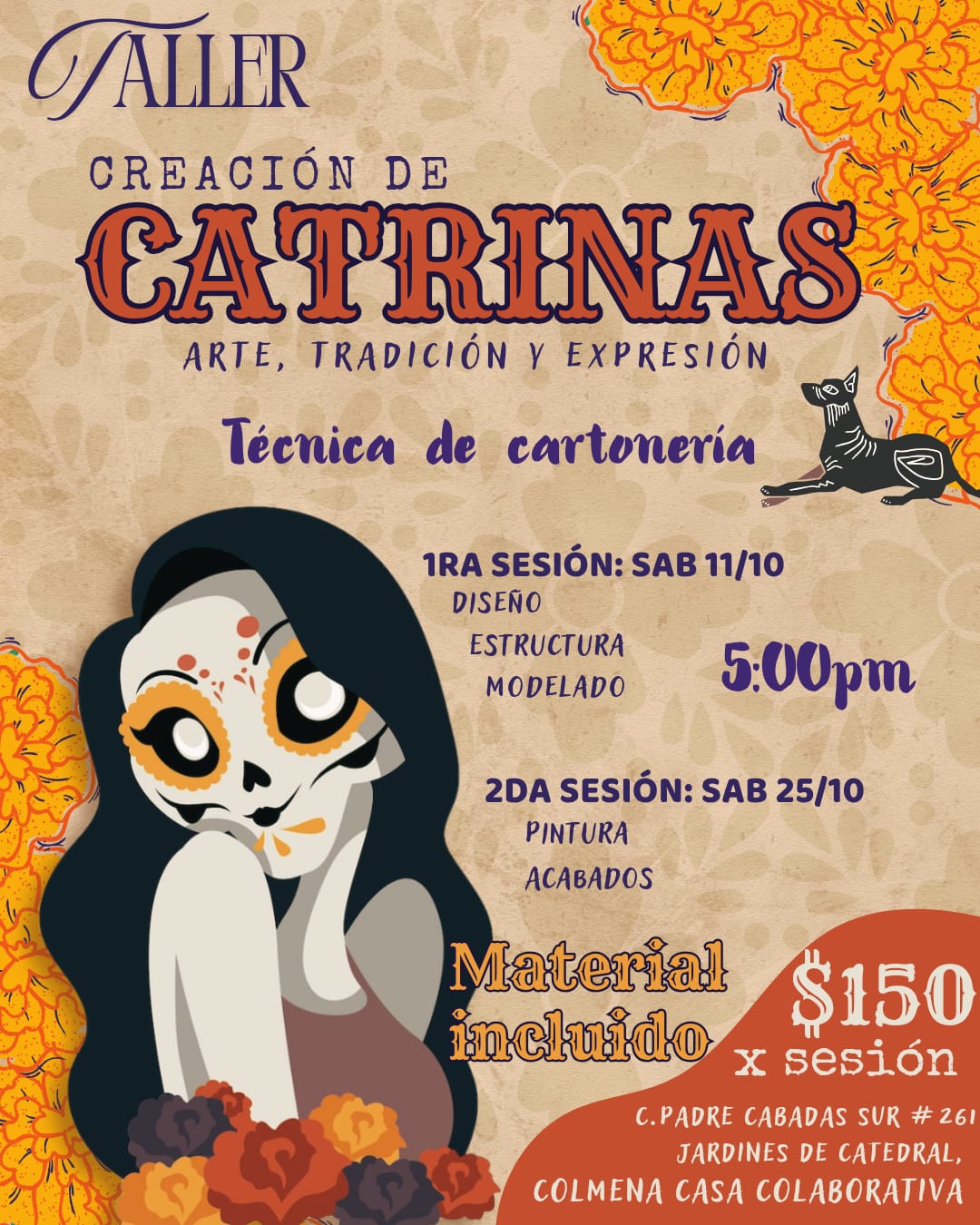 El primer taller, Creación de Catrinas, será impartido por Alma Maciel el sábado 11 de octubre a las 5:00 p.m., con una segunda sesión el sábado 25 de octubre. Cada sesión cuesta $150 e incluye materiales. Se abordará desde el diseño y modelado en cartonería, hasta la pintura y acabados.