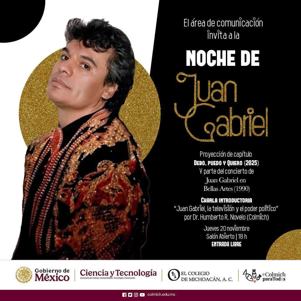 El próximo jueves 20 de noviembre, el Departamento de Comunicación del Colegio de Michoacán (Colmich) llevará a cabo la "Noche de Juan Gabriel", un evento cultural abierto a toda la comunidad que se realizará en el salón principal a las 18:00 horas. La actividad contempla la proyección de un capítulo de la serie dedicada al intérprete y fragmentos del emblemático concierto que ofreció en el Palacio de Bellas Artes en 1990. Como parte del programa, el Dr. Humberto R. Novelo impartirá la charla introductoria titulada "Juan Gabriel, la televisión y el poder político".