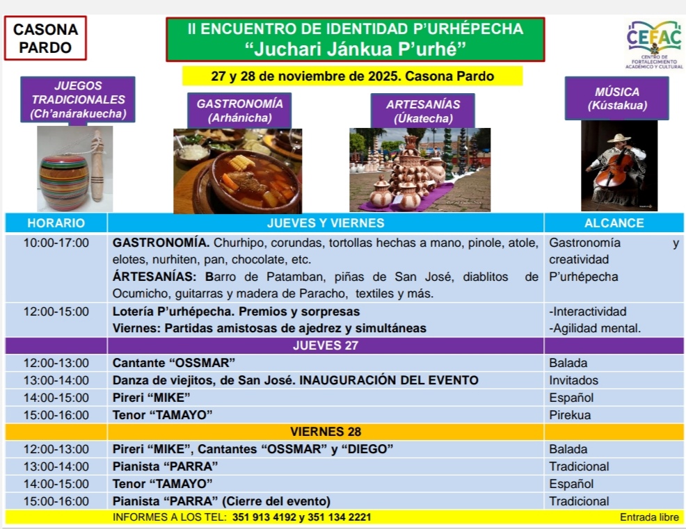El jueves 27 y viernes 28 de noviembre se llevará a cabo en la Casona Pardo el segundo encuentro de identidad p?urhépecha "Juchari Jánkua P?urehé", organizado por el Centro de Fortalecimiento Académico y Cultural (CEFAC). Las actividades comenzarán a las 10 de la mañana y estarán abiertas a toda la ciudadanía interesada en conocer y participar en las expresiones culturales originarias.