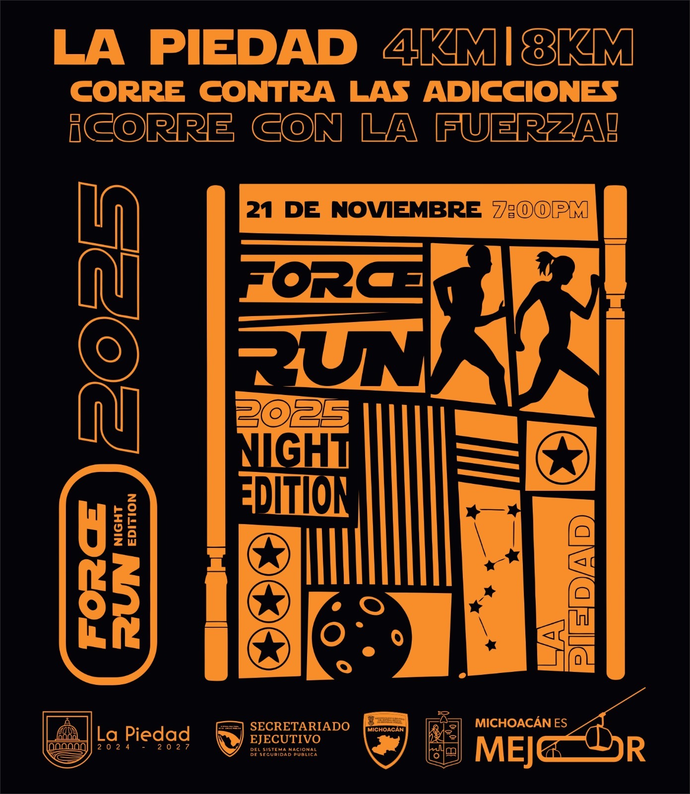 Con el lema inspirado en La Guerra de las Galaxias, el gobierno municipal de La Piedad, en coordinación con el gobierno del estado a través del Secretariado Ejecutivo del Sistema Nacional y Estatal de Seguridad Pública, invita a toda la ciudadanía al *FORCE RUN*, una carrera temática que busca fomentar la activación física y promover hábitos saludables como herramienta de prevención contra las adicciones.