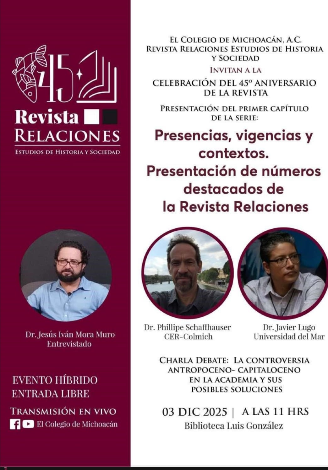 El próximo 3 de diciembre, a partir de las 11 de la mañana, se celebrará el 45 aniversario de la Revista Relaciones, publicación académica del Colegio de Michoacán que se ha consolidado como referente en el ámbito de las ciencias sociales. La conmemoración tendrá lugar en la Biblioteca Luis González, espacio emblemático para la investigación en la región, y contará también con transmisión virtual a través de la página institucional.