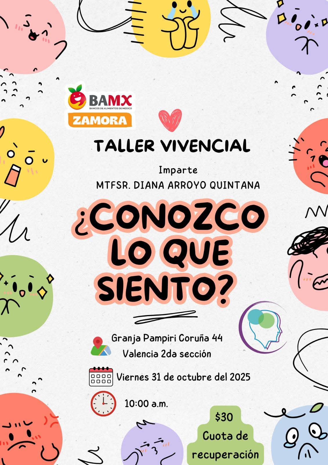 El próximo viernes 31 de octubre, el Banco de Alimentos de Zamora será sede de un taller que busca abrir un espacio de escucha, reflexión y acompañamiento emocional. Bajo el título "¿Conozco lo que siento?", la actividad forma parte de las iniciativas del Mes de la Salud Mental y está organizada por Itzayana Negrete, nutrióloga de la institución.