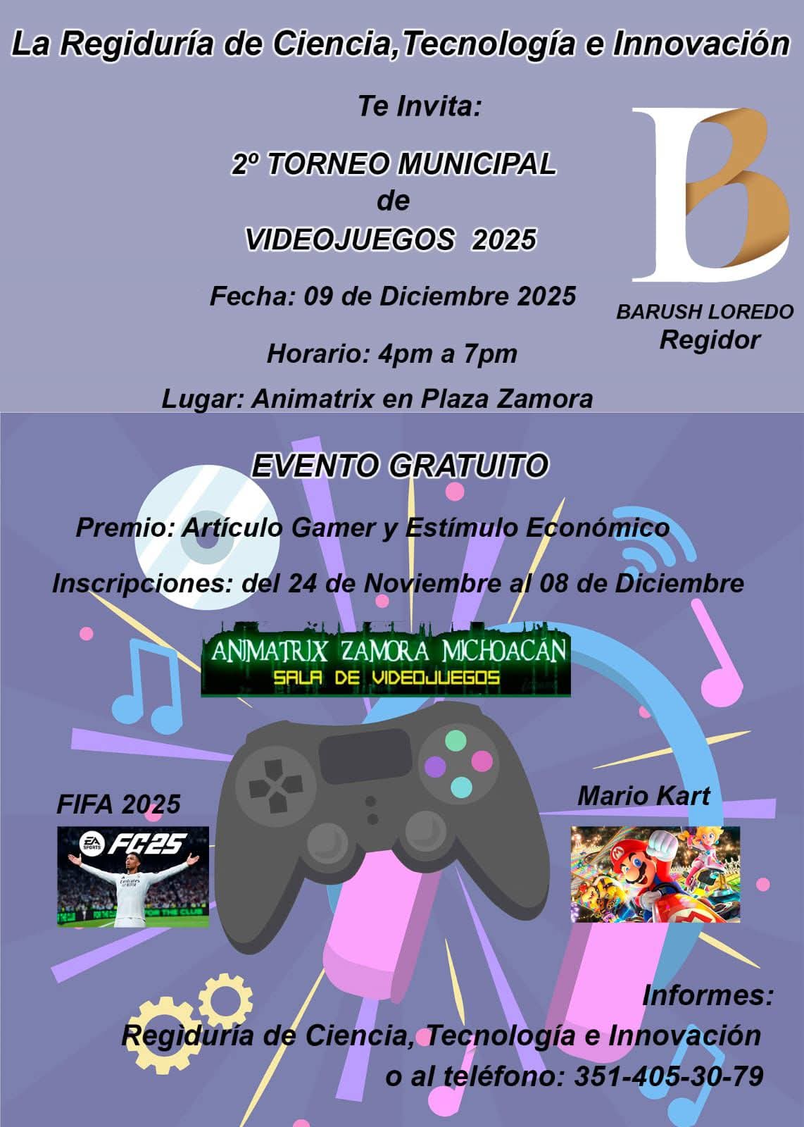 El próximo 9 de diciembre se llevará a cabo el Segundo Torneo Municipal de Videojuegos, un evento impulsado por la Regiduría de Ciencia, Tecnología e Innovación en colaboración con la sala de videojuegos Animatrix Centro, ubicada en la segunda planta de Plaza Zamora.