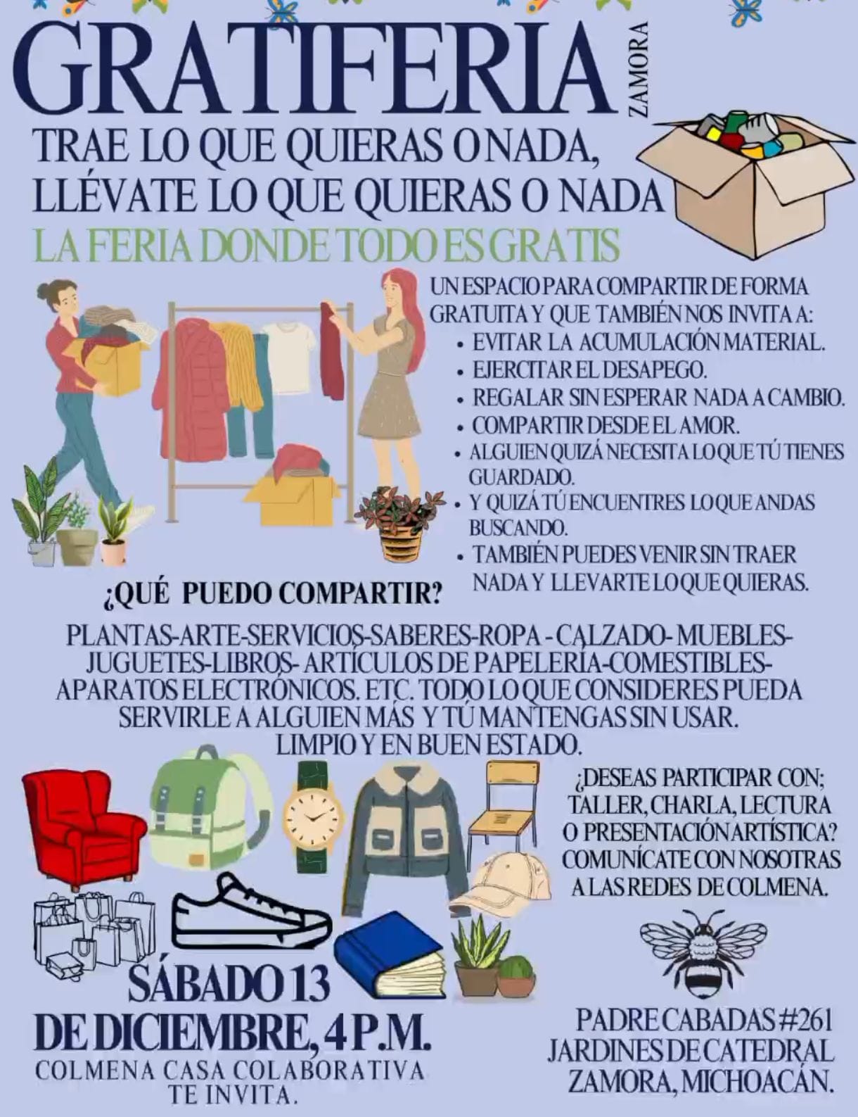 El próximo 13 de diciembre, a las 4 de la tarde, la Colmena Colaborativa llevará a cabo una feria gratuita abierta a toda la comunidad. La propuesta consiste en montar un tianguis en el que cada mesa se convierte en un espacio de intercambio solidario: todo lo que se coloque estará disponible sin costo alguno. La dinámica busca ofrecer una alternativa al consumo tradicional, donde el dinero es el eje central, y abrir un espacio para compartir desde la gratuidad.