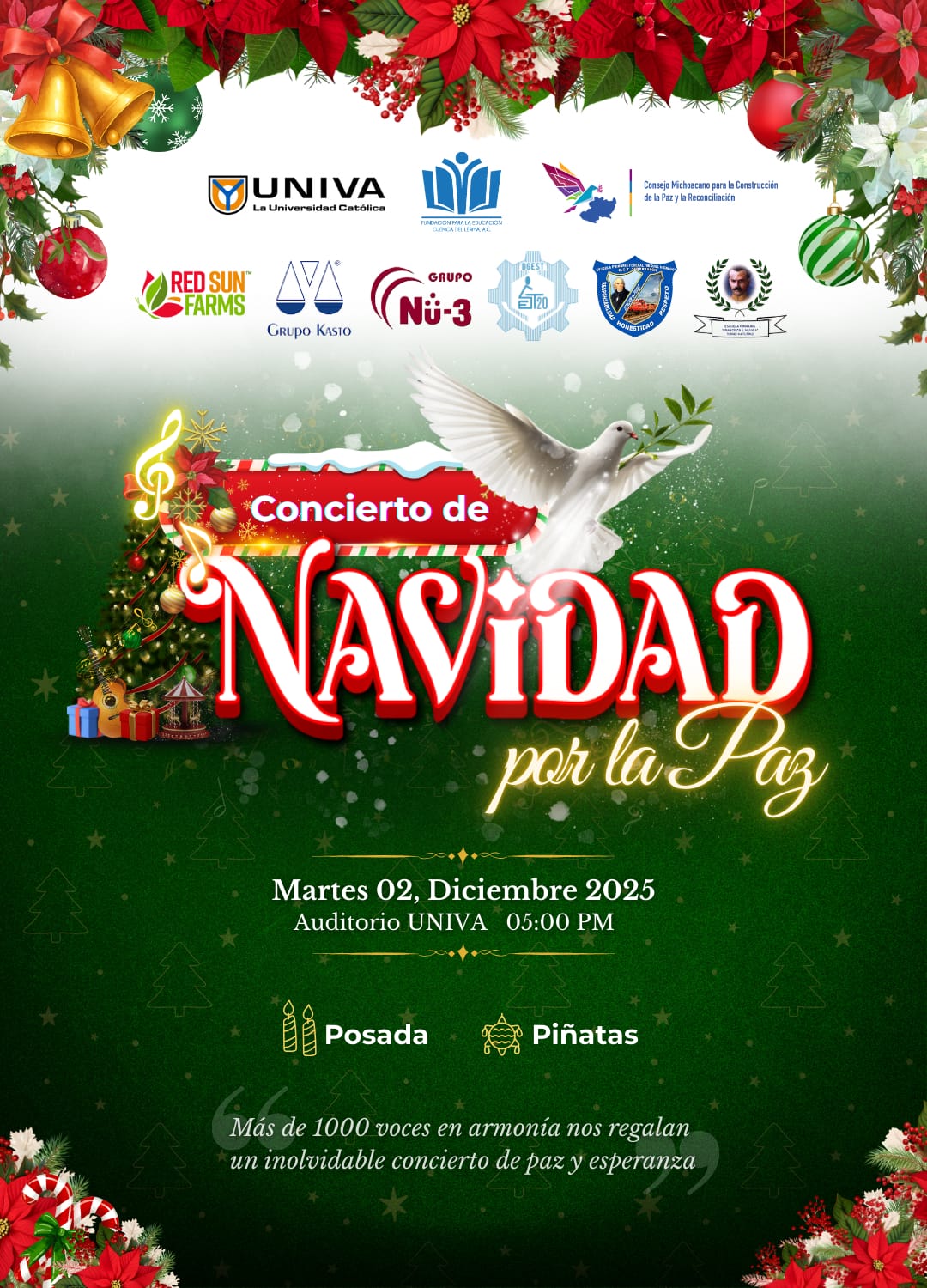 La Dra. Salinas Bravo, directora de UNIVA La Piedad, extendió una invitación abierta a toda la ciudadanía, destacando que "UNIVA y sus eventos son de toda la ciudad, no de unos cuantos", por lo que llamó a disfrutar y acompañar este mensaje de unión y esperanza a través de la música. Tras la presentación, la comunidad universitaria llevará a cabo su tradicional posada, por lo que asistir al concierto permitirá a los asistentes formar parte de una tarde llena de talento, convivencia y espíritu navideño.